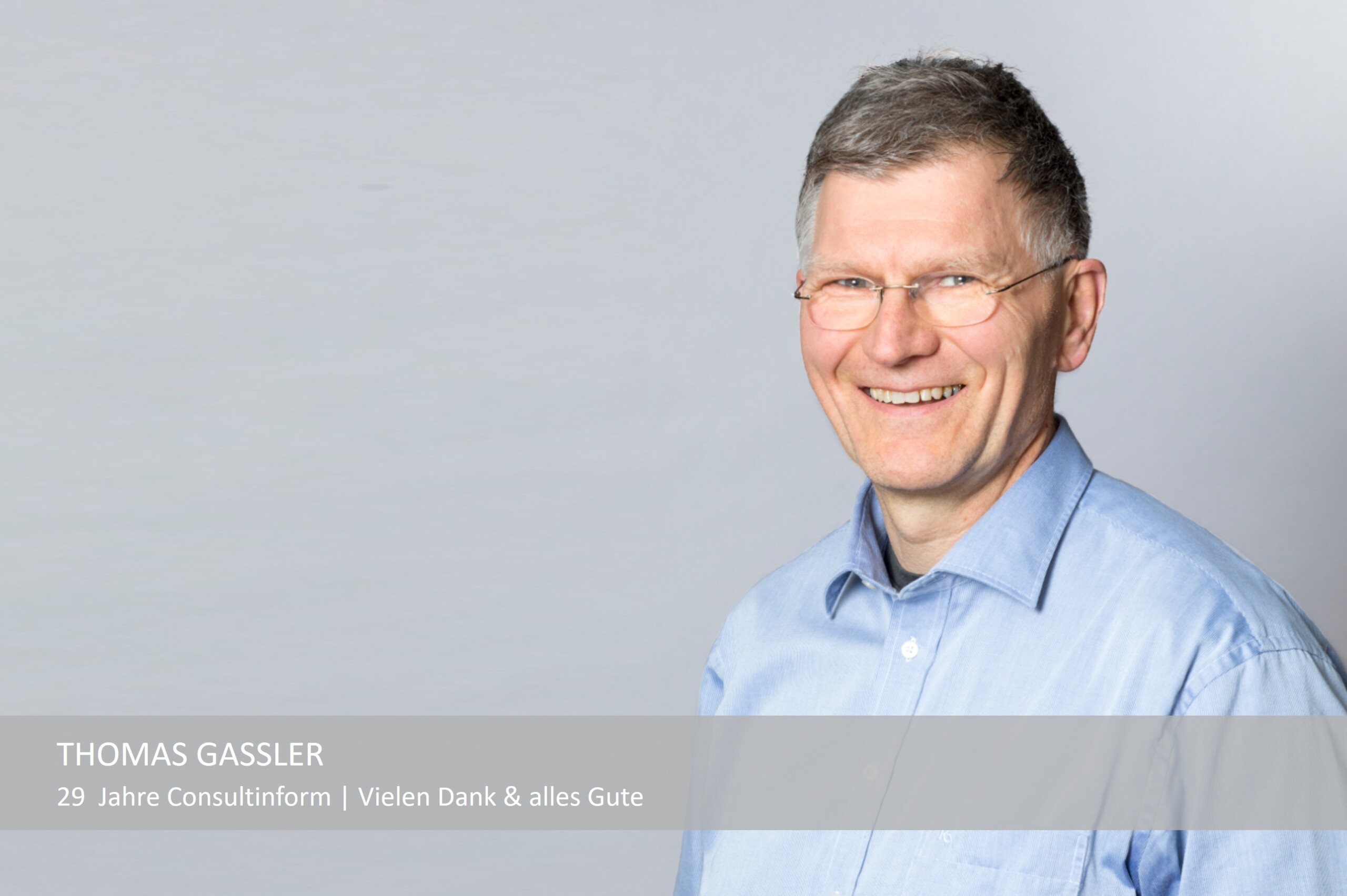 Seit seinem Eintritt im Jahr 1996 in die Consultinform AG (firmierte damals noch als Einzelfirma), war Thomas Gassler eine feste Grösse und beliebter Ansprechpartner für unsere Kunden. Mit seinem umfangreichen Fachwissen, seiner hohen Einsatzbereitschaft und seiner Persönlichkeit hat er unsere Eigenentwicklung Project Account – das ERP für Projekte – sowie auch Consultinform in den vergangenen Jahrzehnten in seinen vielfältigen Funktionen aktiv mitgeprägt.